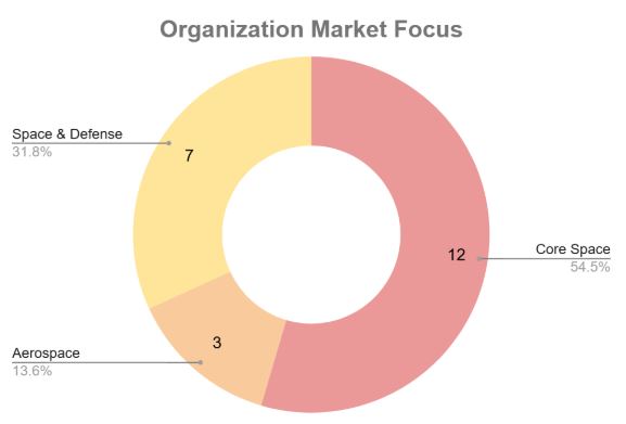 Respondents covered a very broad range of focus areas, with the largest groups being Space Force/Military, Aerospace Manufacturing, Satellite Manufacturing & Servicing, Earth Sensing, and Space Data.
