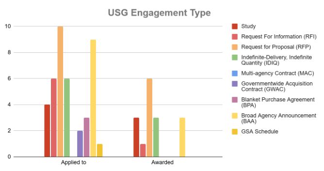 Graphic: New York space companies have a wide range of engagement types with the U.S. government. A majority of the work has been in the area of Studies, RFPs, and RFIs, but companies also had numerous other types of engagement vehicles.