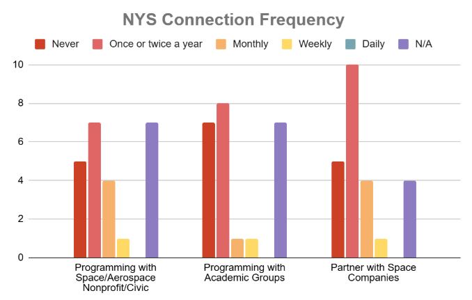 Graphic: Companies reported generally quite low levels of connectivity with other components of the New York space ecosystem. ‘Never’ and ‘Once or Twice a Year’ were the most common responses regarding connectivity with Nonprofits, Academic Groups, and other Space Companies. The group with the highest relative connectivity appears to be other space companies, likely through supply networks, trade conferences, and organization affiliations.