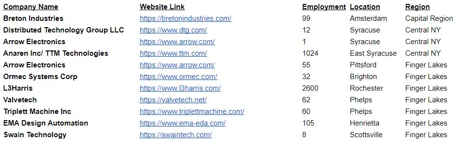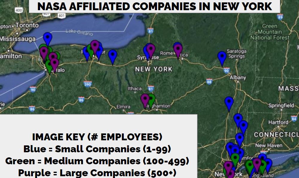 The map below shows the wide geographic distribution of these NASA affiliated companies throughout New York. There are obvious clusters on Long Island, NYC, Rochester, Buffalo, Syracuse, and Binghamton. While there is decent activity in the Hudson Valley, the Capital Region around Albany is a conspicuous exception.